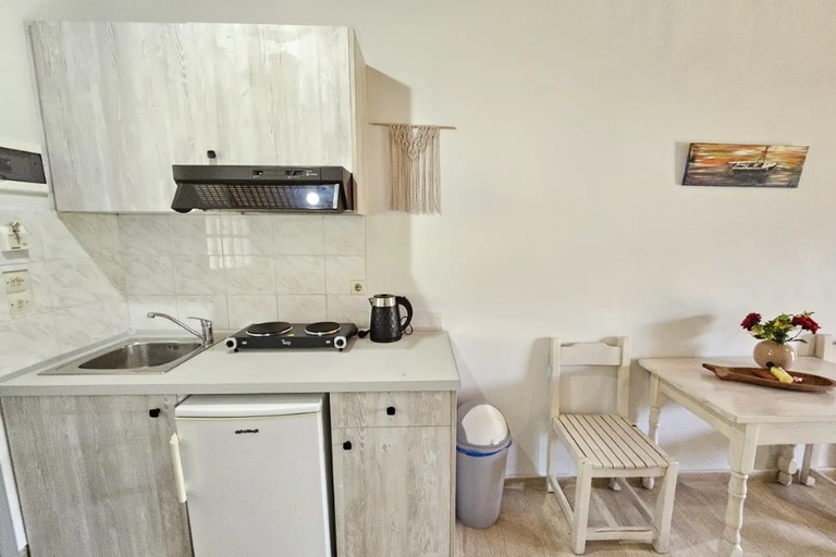 Elk appartement is geschikt voor twee personen. De badkamer heeft een douche en een toilet. Verder is er een kleine keuken, televisie, airco, wifi en een terras met zitje.