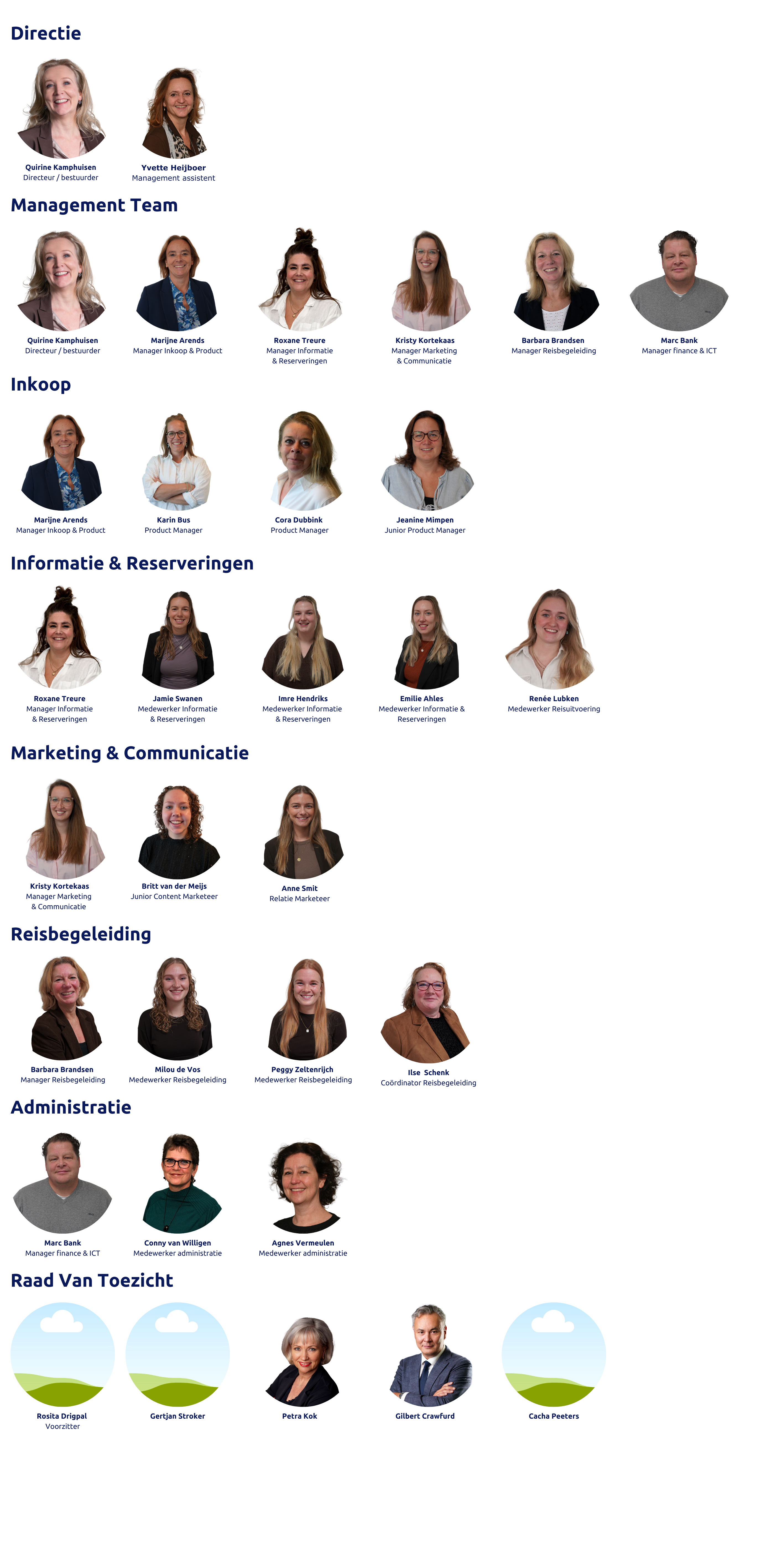 Achter Buitenhof Reizen staat een team van bevlogen professionals. Samen zorgen zij ervoor dat iedere reis tot in de puntjes geregeld is. Van de eerste boeking tot de thuiskomst: onze medewerkers werken met hart en ziel aan zorgeloze vakanties, waarin aandacht en kwaliteit altijd voorop staan.