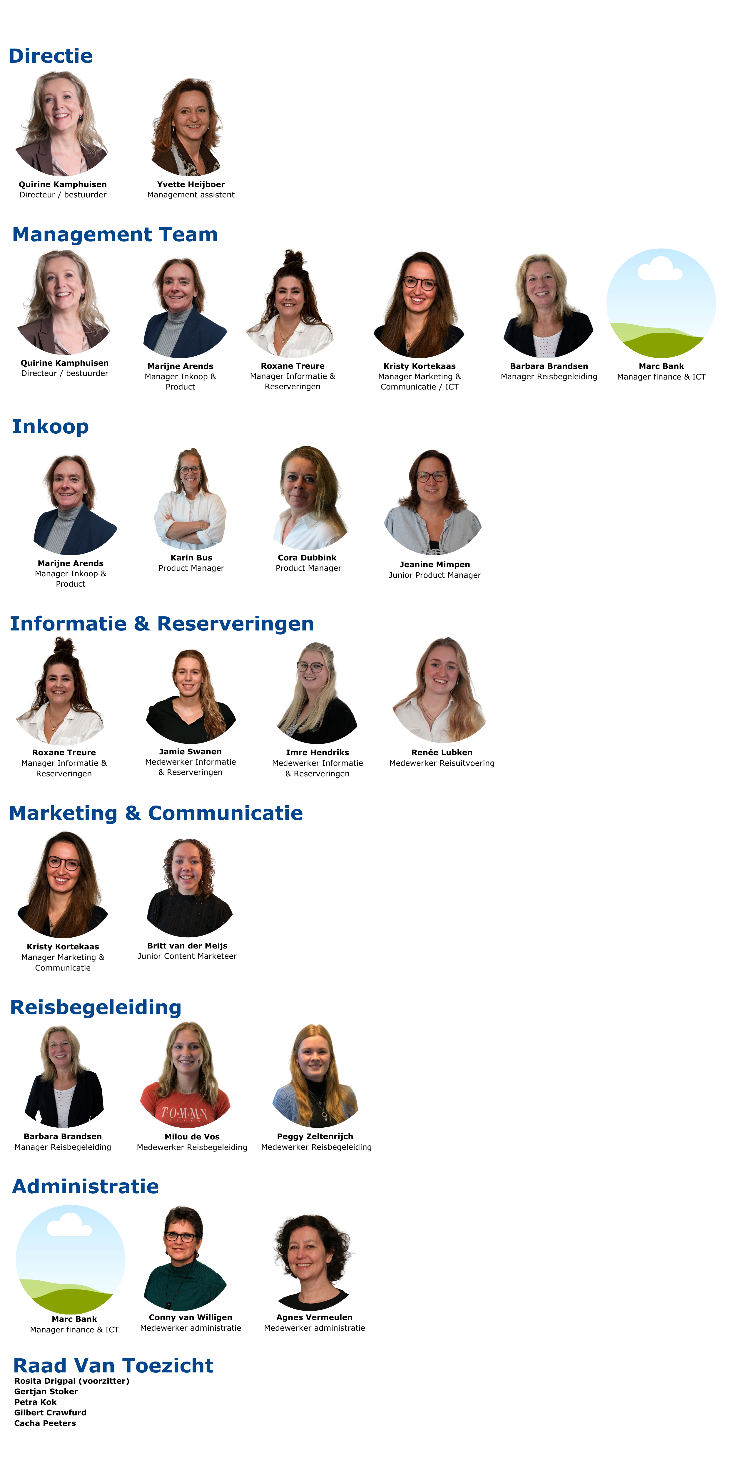 Achter Buitenhof Reizen staat een team van bevlogen professionals. Samen zorgen zij ervoor dat iedere reis tot in de puntjes geregeld is. Van de eerste boeking tot de thuiskomst: onze medewerkers werken met hart en ziel aan zorgeloze vakanties, waarin aandacht en kwaliteit altijd voorop staan.