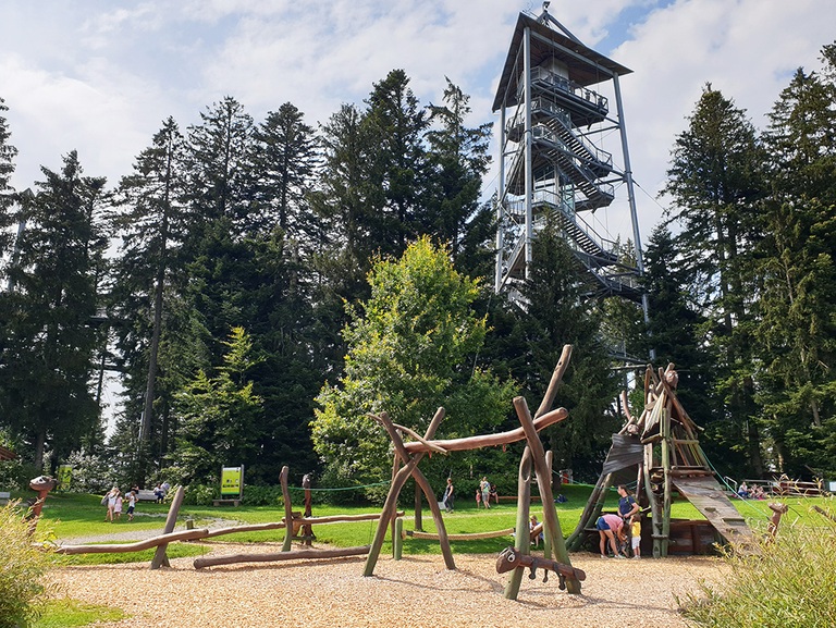 Eén van de hoogtepunten is een rit met de Hündle Bergbahn gondel. We stappen in een gondel die ons rustig omhoog de berg op brengt. Terwijl we naar boven zweven, zien we de prachtige natuur om ons heen. In de verte kun je zelfs de hoge bergen van Zwitserland bewonderen. Het uitzicht is echt adembenemend en geeft je het gevoel dat je boven de wereld zweeft.
