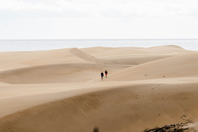 We bezoeken de zandduinen van Maspalomas. Het lijkt hier een beetje op een woestijn.